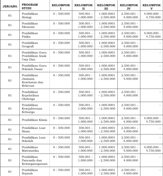 Dimana secara garis besar, biaya UKT Universitas Negeri Padang sendiri digolongkan menjadi 5 kelompok. Penentuan kelompok biaya Universitas Negeri Padang akan dilakukan menilai jumlah penghasilan kotor orang tua, jumlah anggota keluarga, kondisi rumah, Pendidikan anak dan lainnya.