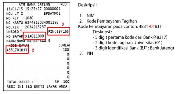 - Jika proses bayar UKT Unsoed sukses maka ATM akan mencetak bukti pembayaran seperti contoh di bawah ini.