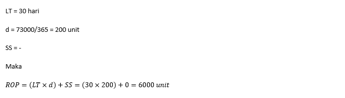 Big Mom mempunyai perusahaan dengan jumlah kebutuhan stok per tahun sebesar 73.000 unit. Bila lamanya proses kirim bahan adalah 30 hari, sedangkan Big Mom tidak mempunyai kebijakan safety stock maka hitunglah besarnya ROP perusahaan Big Mom!