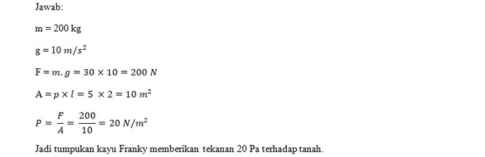 Karena membutuhkan kayu untuk memperbaiki rumahnya, Franky membeli puluhan potongan kayu. Potongan kayu tersebut disusun di atas tanah sehingga berbentuk balok dengan ukuran panjang 5 m, lebar 2 m, tinggi 1 m serta berat totalnya 200 kg. Hitunglah tekanan zat padat dari susunan kayu milik Franky!